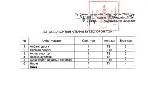 | 1 | Дотоод аудитын албаны дарга | ТЗ-6 | Дэс түшмэл | 1 | Магистр болон түүнээс дээш боловсролын зэрэгтэй, Нягтлан бодох бүртгэл, Санхүү, Эдийн засаг, Эрх зүй Төрийн албанд мэрэгшүүлэх багц сургалтанд хамрагдсан байх; Санхүү , төсвийн асуудал эрхэлсэн төрийн захиргааны төв байгууллага болон түүний зөвшөөрлөөр албан ёсоор зохион байгуулсан сургалтанд хамрагдсан байх, Туслах түшмэлийн албан тушаалд 2-оос доошгүй жил ажилласан байх; Тухайн салбарт мэргэжлээрээ 5-аас доошгүй жил ажилласан байх. |